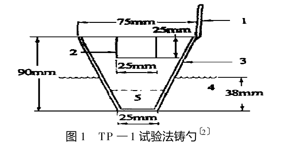 能保溫(718±5) ℃的 11kg 鋁的石墨坩堝電阻爐;標準合格的熱電偶;兩個(gè)錐形鑄勺或鑄模(圖1),內側涂云母薄層外側噴石墨;鑄勺預熱(至316℃) 爐;計時(shí)器;石墨攪拌棒;簡(jiǎn)易夾鉗;水冷卻槽(圖2) ;工作服和面罩等。